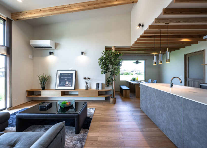 築上郡椎田町で落ち着いた雰囲気の住宅が完成しました。リビングとダイニングが一つの空間にありながらも、もう一つ部屋があるかのような配置にしました。 かつ、キッチ…