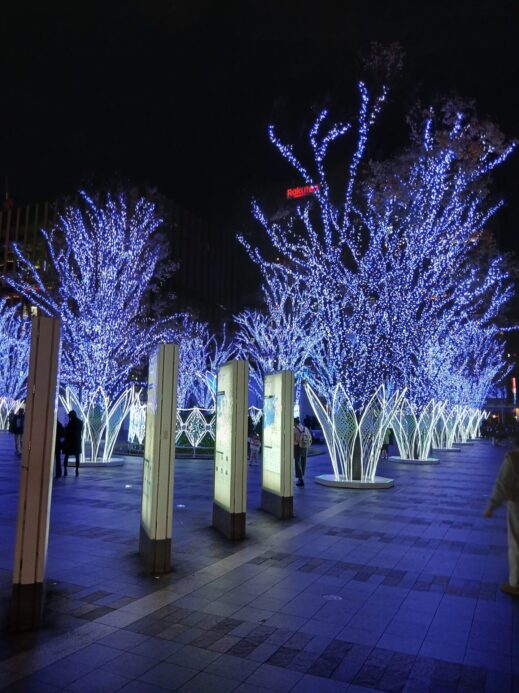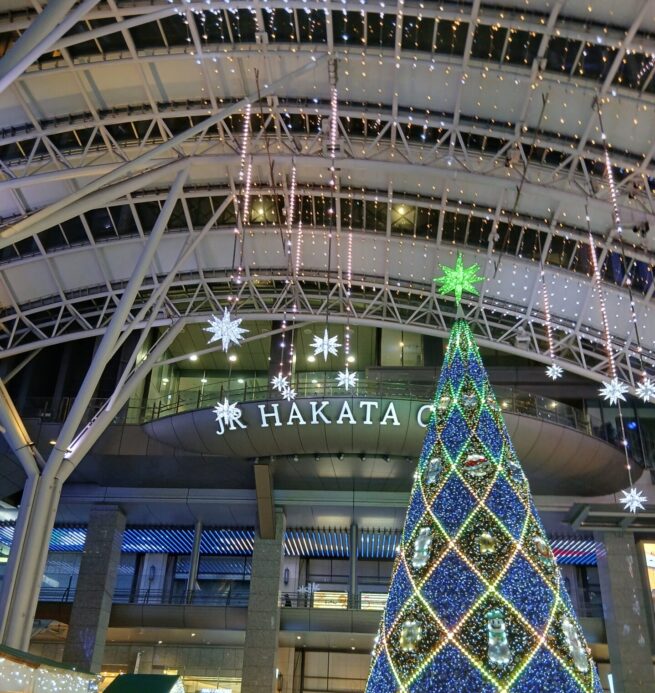 博多の駅前はクリスマス一色といった感じで光り輝いていました。