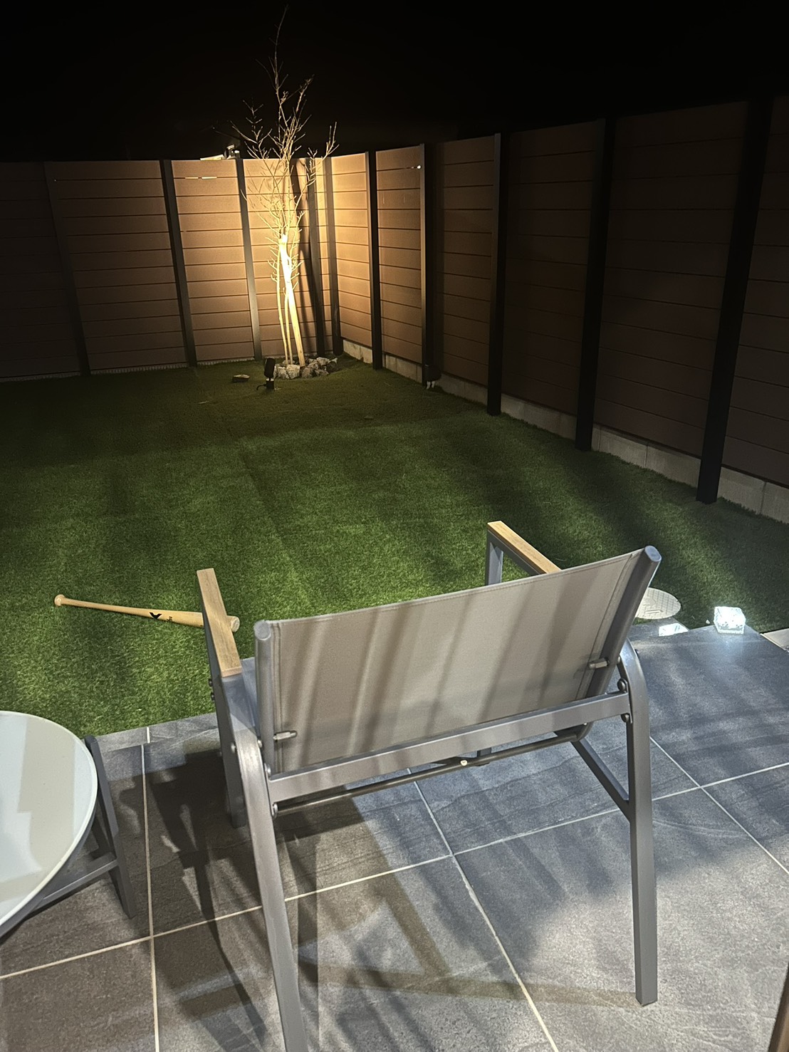 外構は人工芝・タイルデッキにし、奥にはアオダモを植えました。外部からの視線は遮断したかったので、目隠しフェンスは200㎝にしました。庭では大体私が素振りしてます。