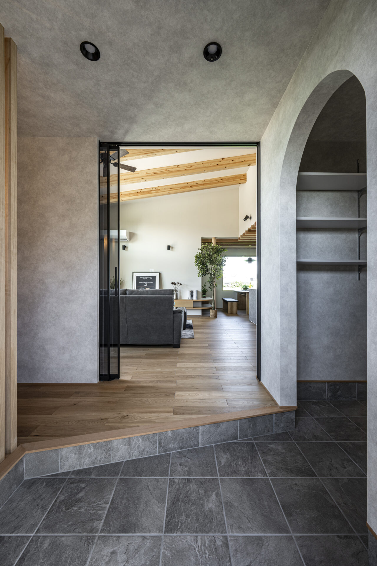 リビングは吹き抜けにしている為、より解放感が出るよう玄関はあえてグレーを基調のテイストにしました。