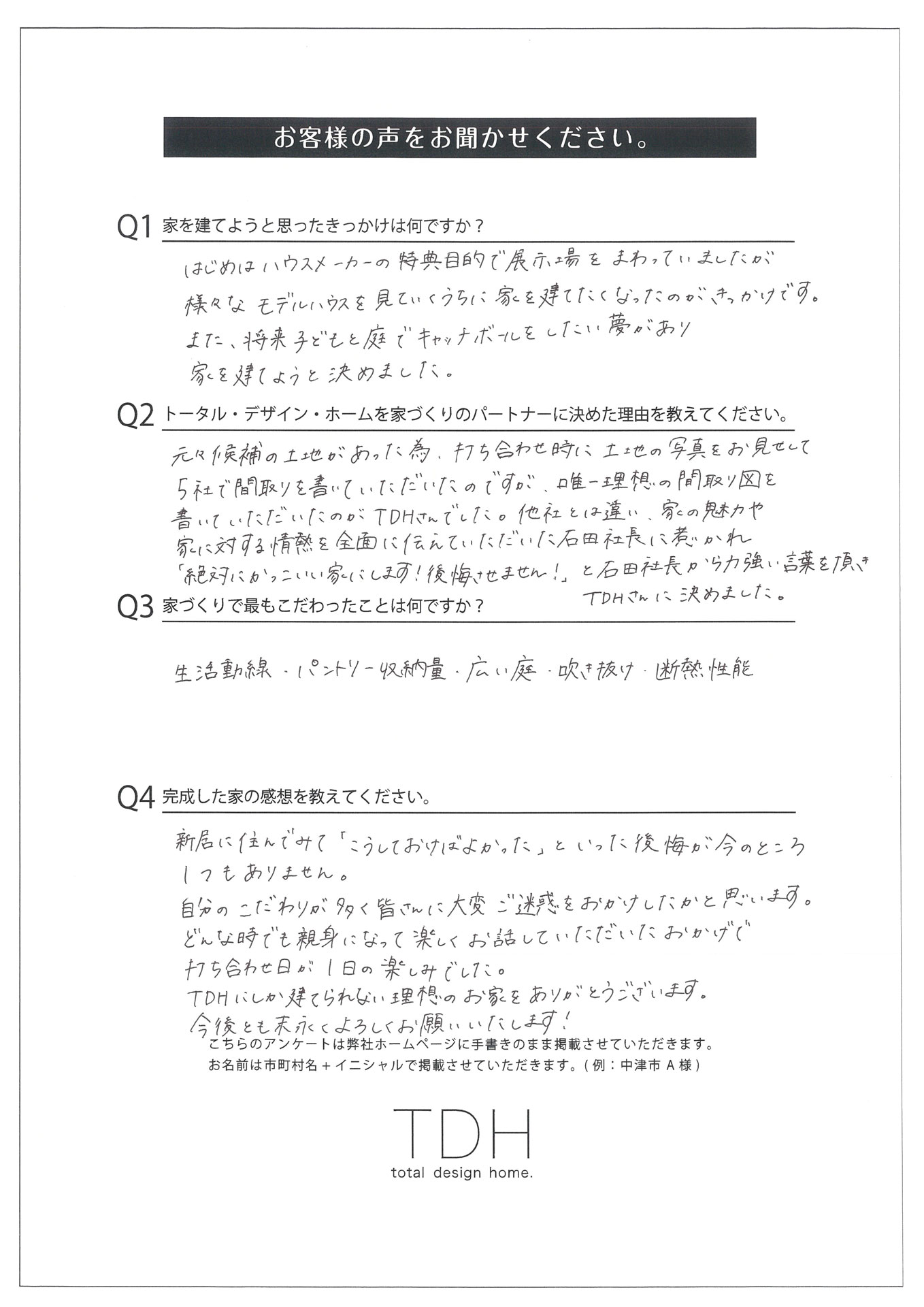 元々候補の土地があった為、打ち合わせ時に土地の写真をお見せして、5社で間取りを書いていただいたのですが、唯一理想の間取り図を書いていただいたのがTDHさんでした。他社とは違い、家の魅力や家に対する情熱を全面に伝えていただいた石田社長に惹かれ「絶対にかっこいい家にします!!後悔させません!」と石田社長から力強い言葉を頂き、TDHさんに決めました。